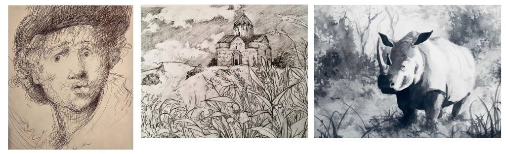 - Crayon, fusain, aquarelle, pastel, crayon conté, encre de Chine et pinceau asiatique, peintures…